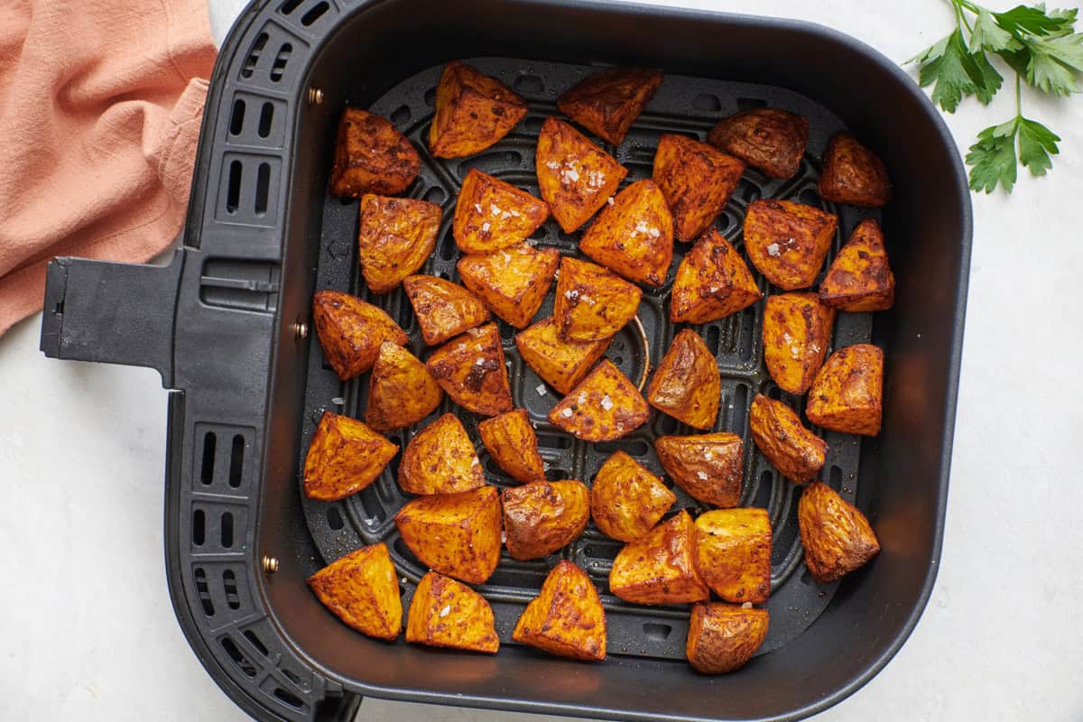 - Transfer the potatoes to the air fryer and arrange in a single layer. You may need to cook in two batches. Cook until crispy with golden brown edges, shaking the basket halfway through, 20-25 minutes total.