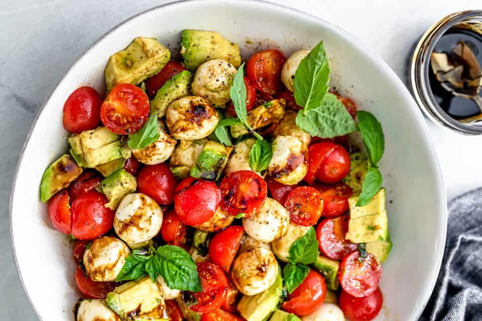 When I make my Avocado Caprese Salad, I like having equal parts of pearl mini mozzarella, cherry tomatoes, and avocado. Drizzled with olive oil and a balsamic glaze, this salad takes just 10 minutes to put together.