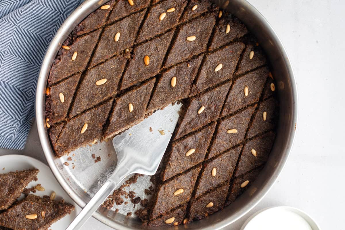 - Slice kibbeh diagonally to form small diamonds. Top with pine nuts, and drizzle with olive oil to coat the top layer. Bake until meat is fully cooked and pine nuts look toasted, about 40-45 minutes.