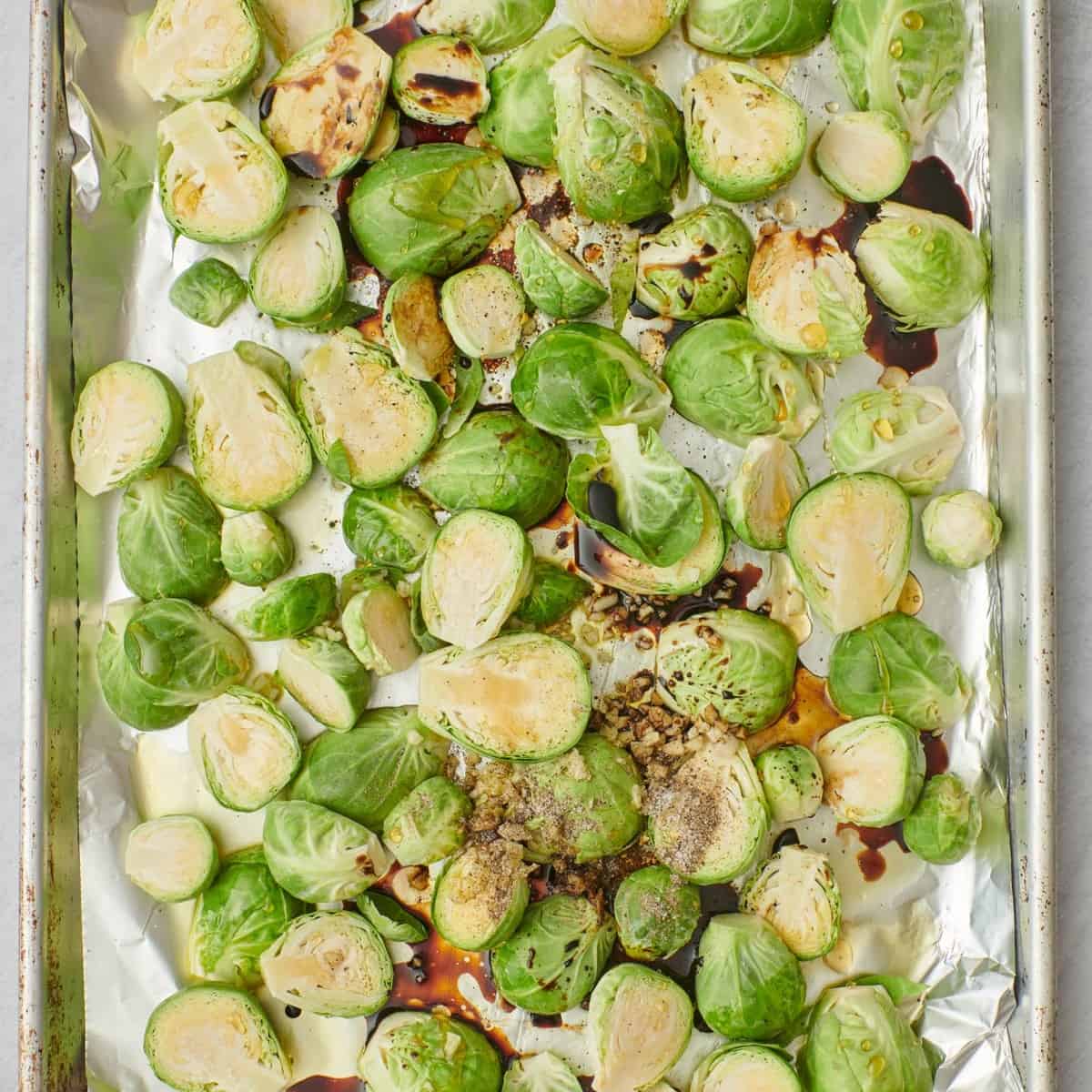 - Place the brussel sprouts directly on the prepared baking sheet. Add olive oil, balsamic, honey, garlic, salt and pepper and toss with your hands until well combined.