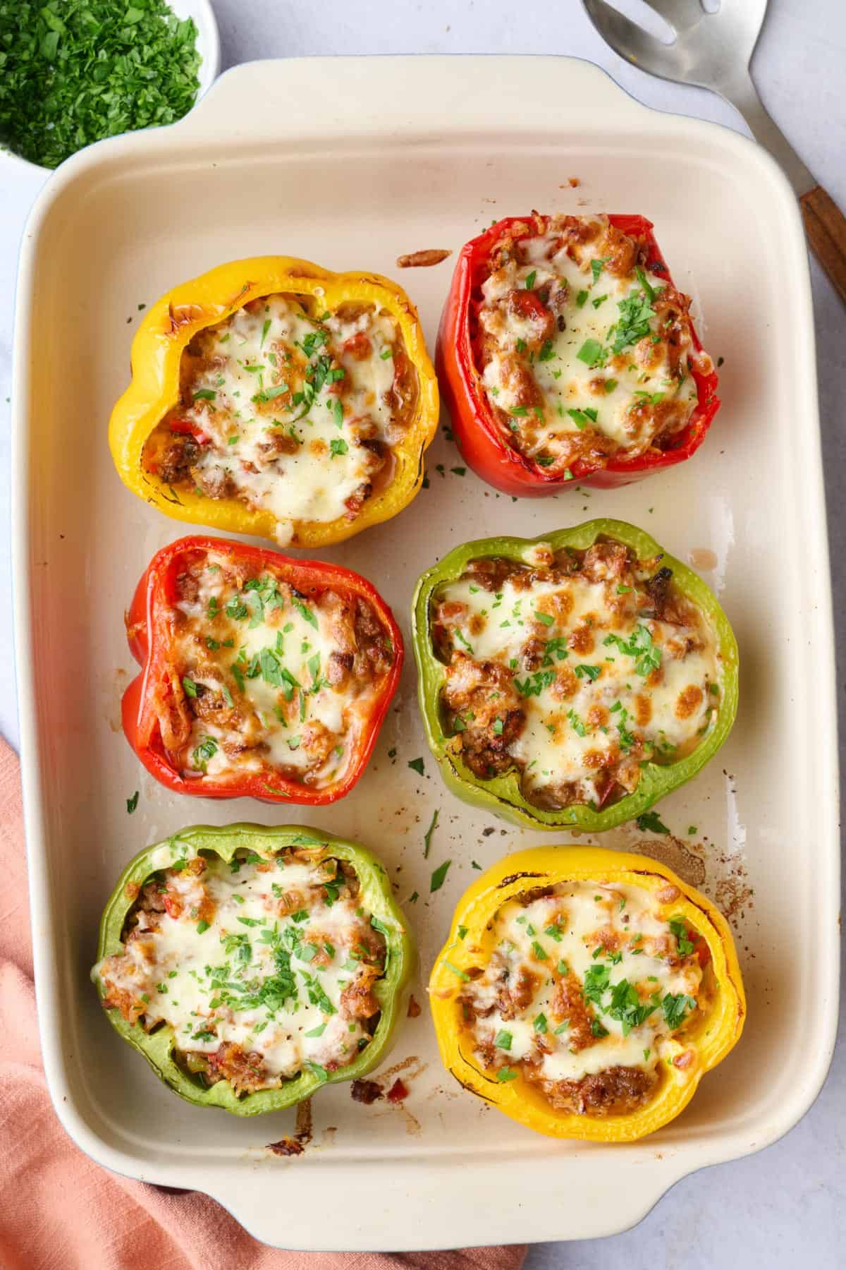 Growing up, ground beef stuffed peppers were one of the dinners I looked forward to the most. My mom made hers with either ground beef or turkey and made sure the peppers were topped with plenty of cheese. It’s not surprising that, as a kid, the melty, cheesy tops were my favorite!
