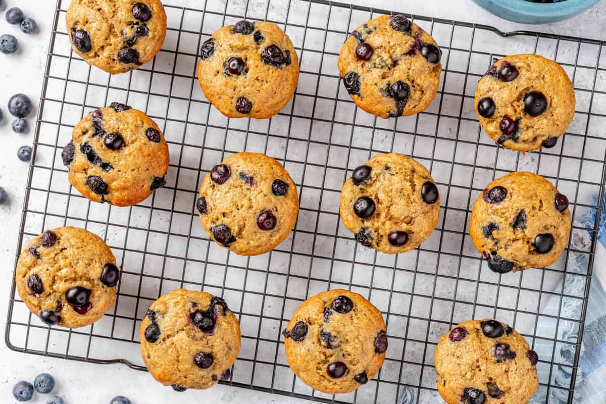 - Divide the batter in the prepared muffin tin. Top each muffin with a couple blueberries. Bake in the preheated oven for 20-24 minutes, or until the muffins are golden brown on top and a toothpick inserted in the center comes out clean.