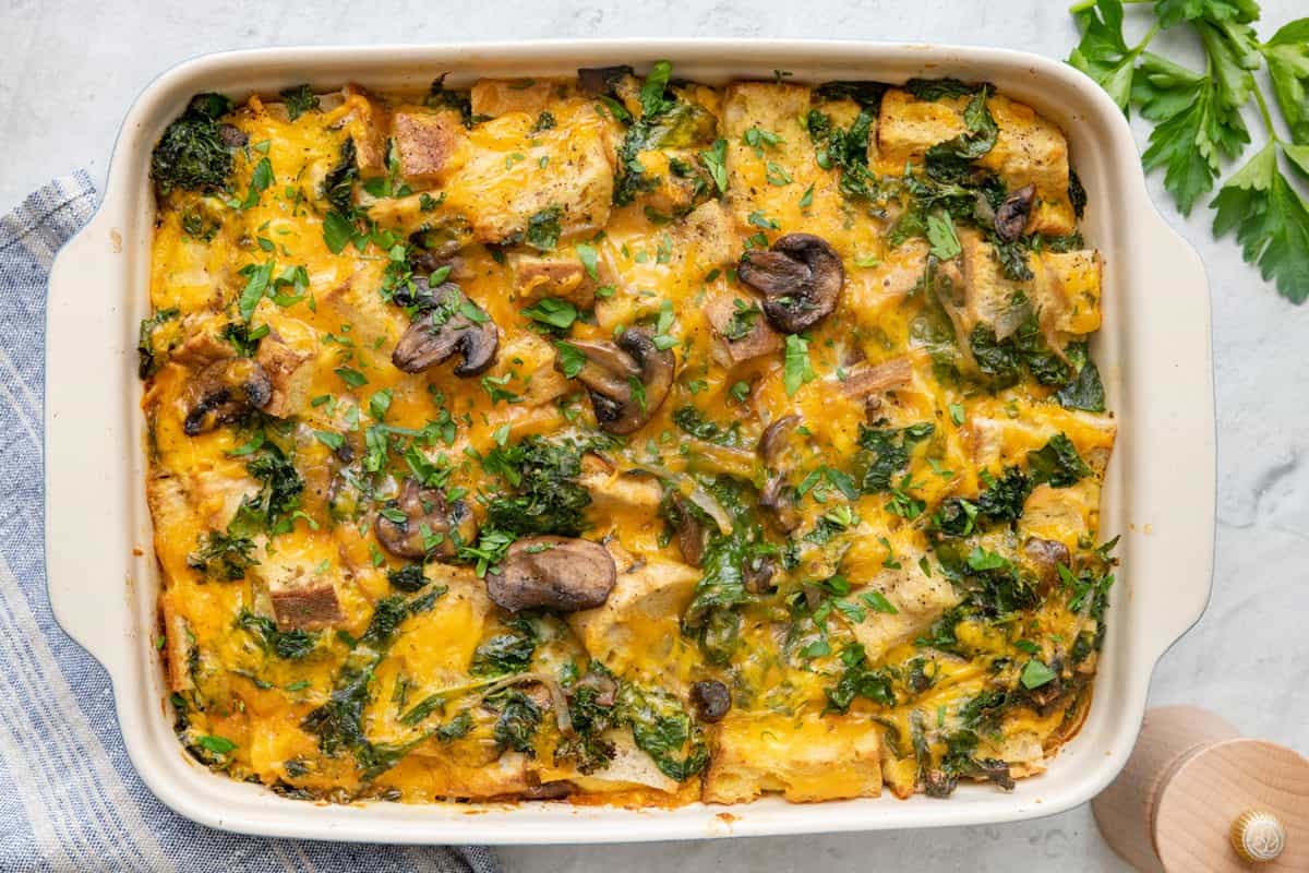 Breakfast egg strata made with bread, eggs, mushrooms, kale, and cheese, an easy overnight brunch recipe baked the next morning.