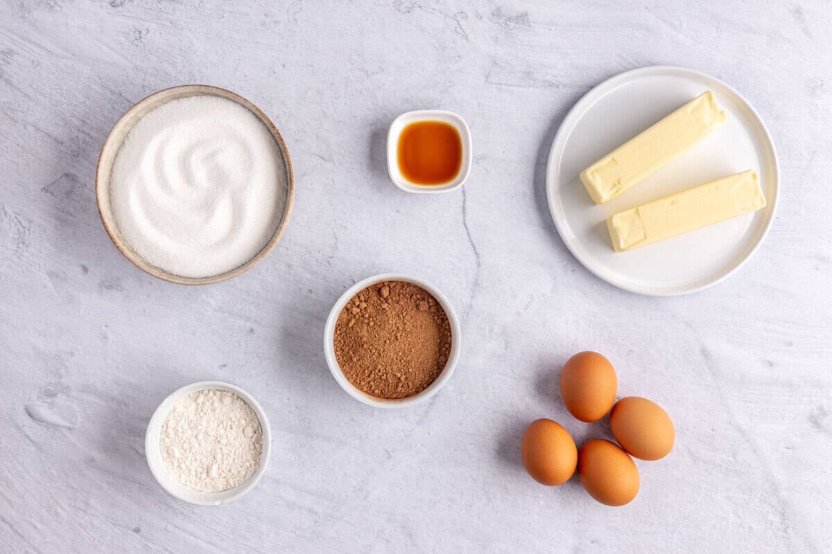 - Dry ingredients: All-purpose flour and cocoa powder. Make sure to sift them together so the cocoa blends evenly and you don’t end up with dry pockets in the batter.