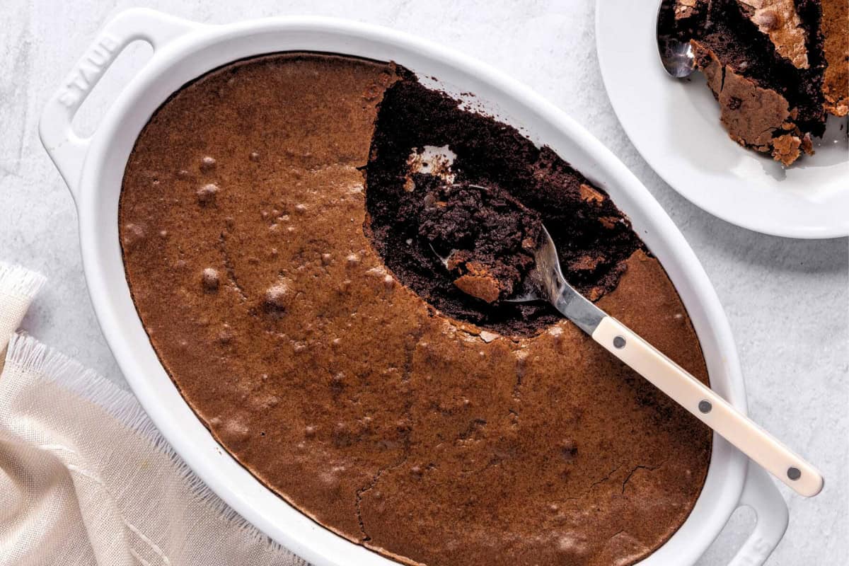 This brownie pudding has the best of both worlds: a fudgy brownie topping with a soft, pudding-like center. Simple ingredients and quick to prep