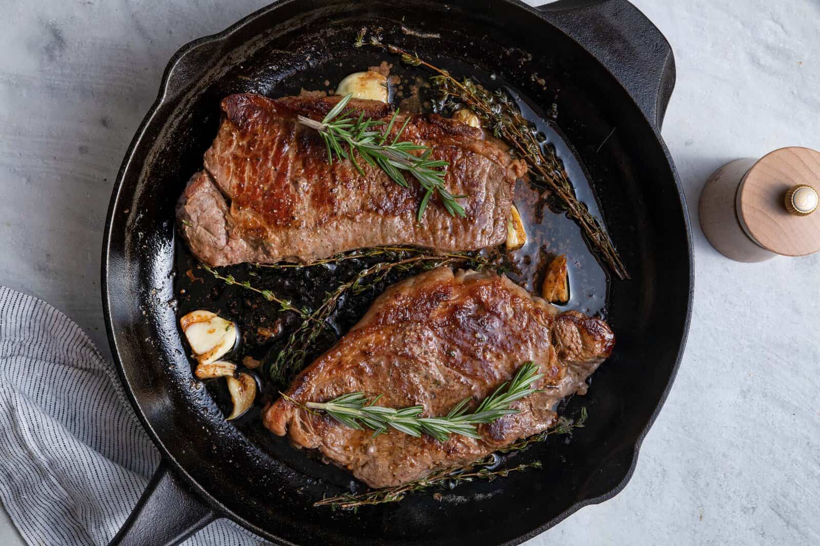 - Steak: I like to use Ribeye or New York Strip steaks in cast iron. For best results, they should be about 1 to 1 ½ inches in thickness.