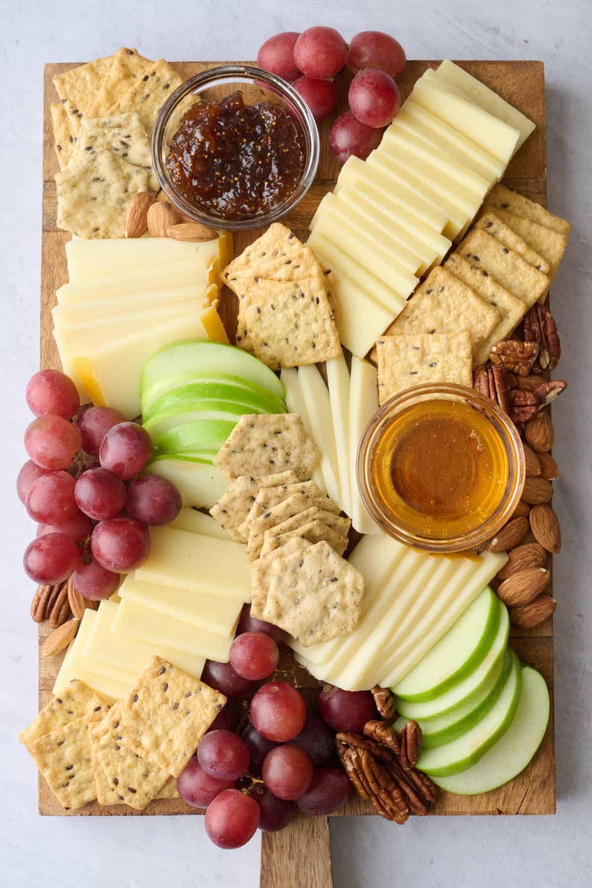 - Accompaniments: This is where you get to have fun with it and add unique items to fill the gaps between the cheese, crackers, and fruits. Think nuts, spreads, dried fruit, dips, jams, honey or even chocolate!