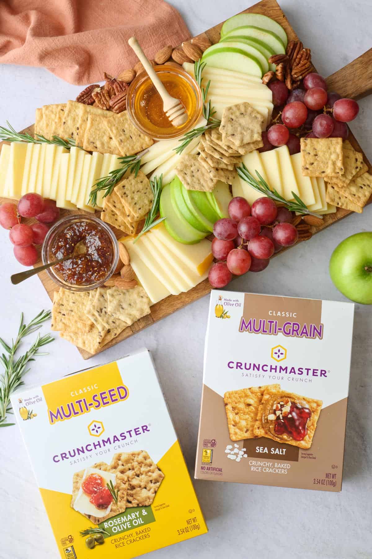 - Crackers: I like to set out a mix of seasoned crackers so there’s something for everyone. My fave are Crunchmaster crackers, they’re crisp, non-GMO, gluten-free, made with olive oil, and have a light, nutty flavor that works so well with pretty much any cheese or topping. I like to do a mix of the Sea Salt and Rosemary & Olive crackers for this holiday inspired fruit and cheese platter, but the roasted garlic or everything bagel seasoning crackers are really good too. I grab mine at Target, Fresh Thyme and Whole Foods, but you can find Crunchmaster crackers at most grocery stores.