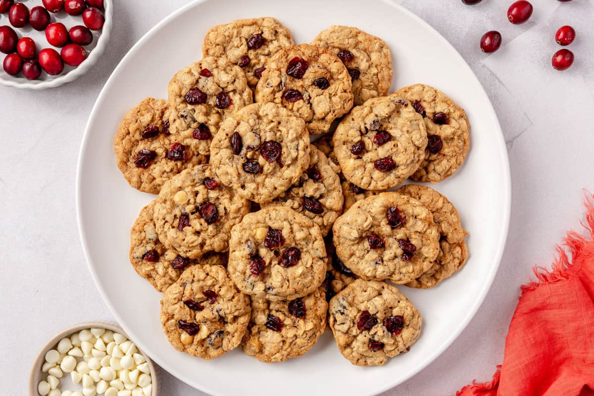 Oatmeal cranberry cookies made with rolled oats, dried cranberries, and white chocolate chips. Ready to eat in under 30 minutes!