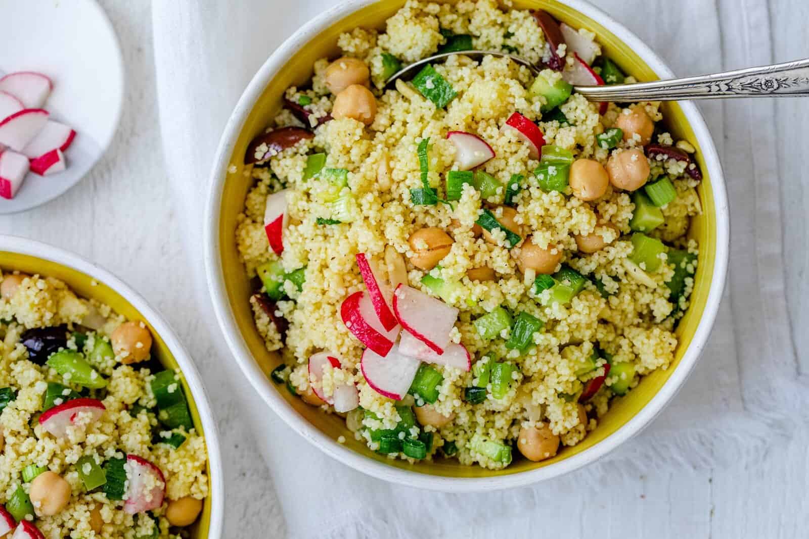 A Mediterranean-style couscous salad recipe made with chickpeas, crunchy vegetables, and a bright lemon dressing. Can be served at room temp or chilled.