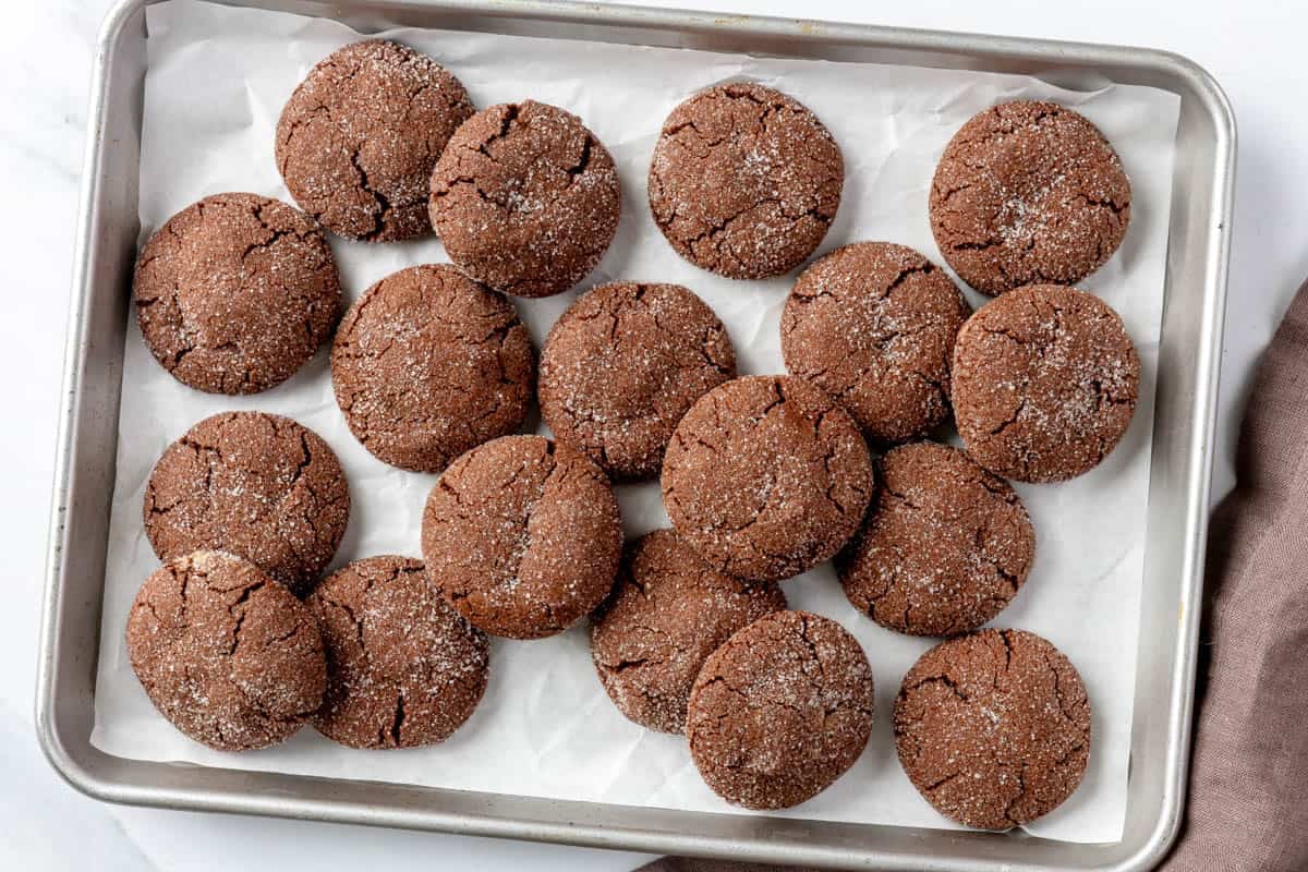 These easy chocolate sugar cookies start like most other cookies: creaming butter and sugar until they’re light and fluffy, then adding the dry ingredients and mixing until a dough forms. The rest of the recipe is simple too! Unlike cut-out sugar cookies that have to rest in the fridge and then be rolled out, these are chocolate sugar cookies no chill! That means after making the dough, you just have to portion it into balls, roll in sugar, and bake. These cookies are so chewy and delicious!