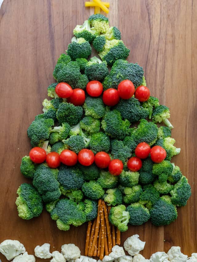I love making this Christmas Tree Vegetable Platter whenever I’m hosting a party or invited to one. I know there will usually be plenty of desserts, so I like having some vegetables for snacking. I like pairing the Christmas tree veggie platter with my Christmas Wreath Charcuterie Board, two easy and festive appetizers that are easy to make and transport to gatherings.