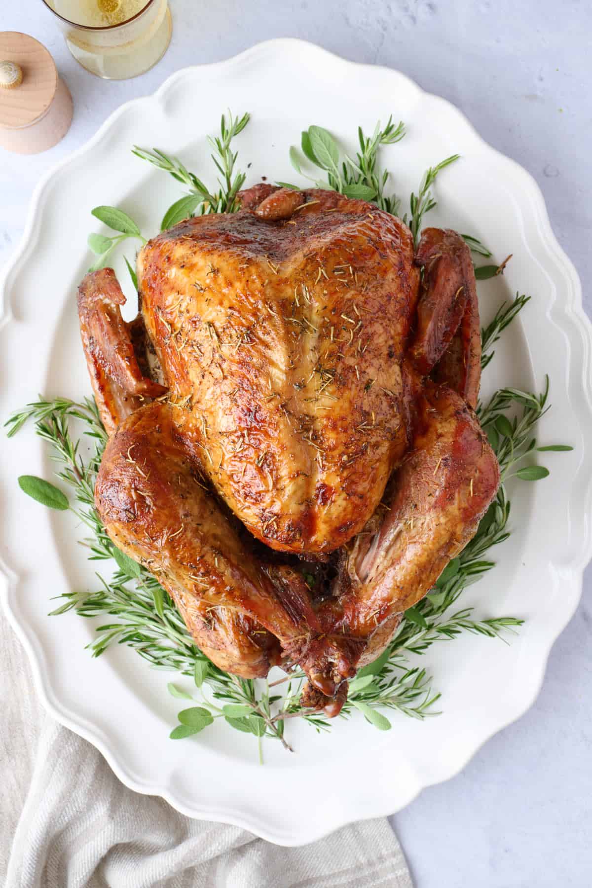This dry brined turkey is made with a herb-loaded salt rub, resulting in a moist turkey with browned, crispy skin.