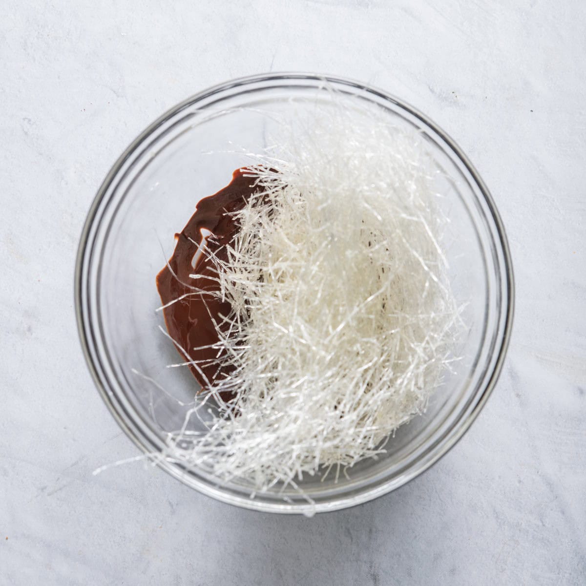 - Place the cooked vermicelli into the bowl of chocolate and use your hands to gently toss the vermicelli with the chocolate until they are completely coated in chocolate.