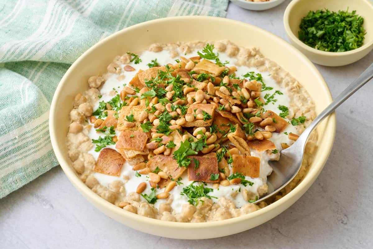 This authentic Lebanese chickpea fatteh hummus recipe has yogurt, chickpeas, tahini, toasted pine nuts, and toasted pita bread!