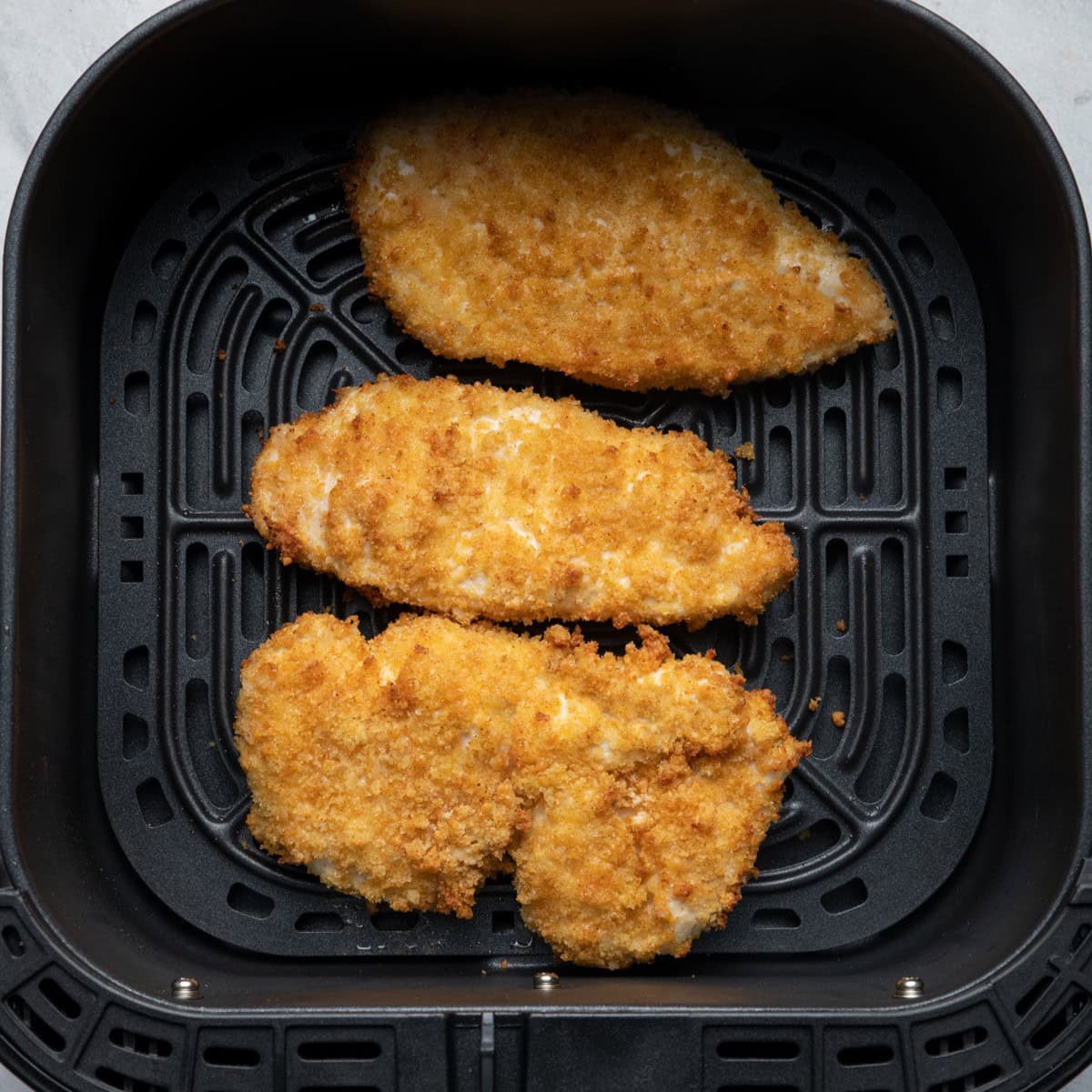 You can bread the chicken up to a day ahead of time and keep it covered in the fridge until you’re ready to cook. The cooked chicken will keep well in an airtight container for up to 4 days in the fridge. To reheat, air fry at 370ºF for 3–4 minutes or until warmed through.