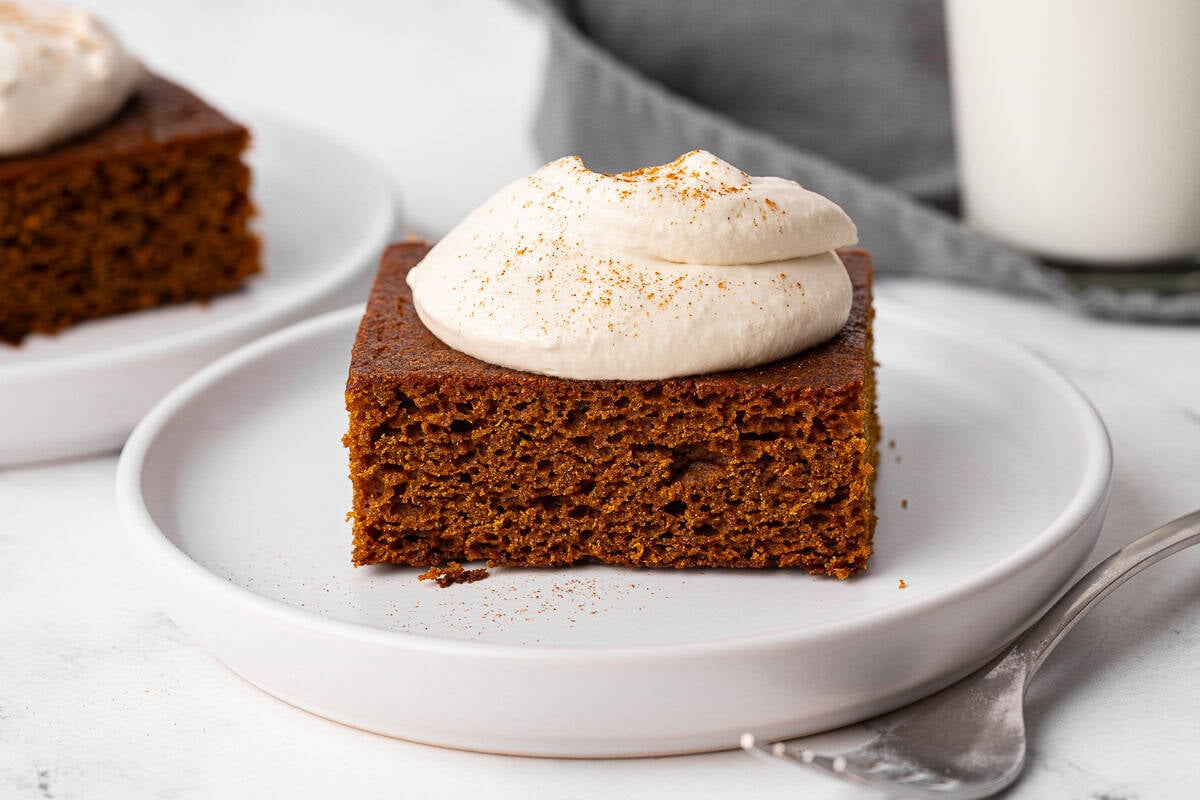 Soft gingerbread cake with molasses, cinnamon, ginger, and cloves, baked until fluffy, finished with brown sugar whipped cream. Simple ingredients and easy to make for the holidays.