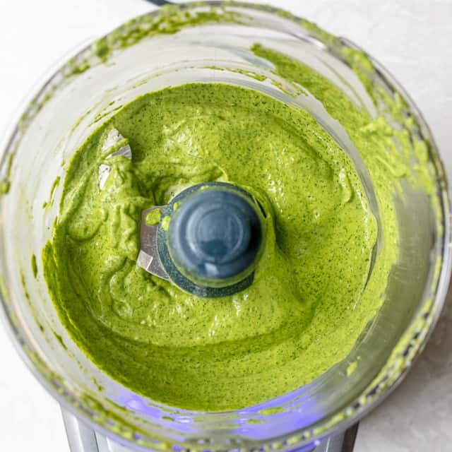 - To make the dressing, combine all the ingredients except for the olive oil in a food processor. While the food processor is running, slowly drizzle the oil until completely emulsified and combined. Adjust the thickness by adding more oat milk or water. And taste to adjust for more salt.