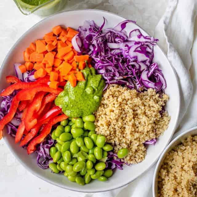- Protein: Black beans, chickpeas & edamame. Each bowl has a different protein to make it more filling. Canned beans work great here, just rinse and drain them well. If you prefer, you could swap in cooked lentils or baked tofu. If you want to add meat to the bowl, try my air fryer salmon, yogurt marinated chicken, or grilled shrimp skewers.