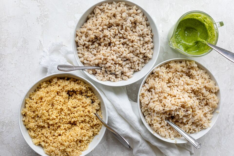 Three healthy Grain Bowl ideas featuring quinoa, farro, and brown rice with colorful vegetables and a garlic cilantro dressing.