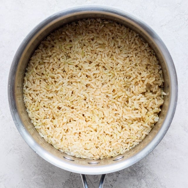 - To cook the brown rice, add the brown rice, 1 ¼ cups water and salt to a pot. Bring to a boil, then reduce to simmer, cover and cook for 40 minutes until all the water is evaporated. Remove from heat, but keep the pot covered for 10 minutes. Fluff with fork and serve.