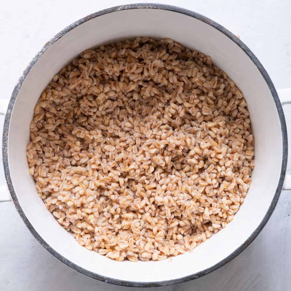 - To cook the farro, add the farro, ¾ cup water and salt to a pot. Bring to a boil, then reduce to simmer, cover and cook for 20 minutes until all the water is evaporated. Remove from heat, but keep the pot covered for 5 minutes. Drain any excess water, if any, fluff with a fork and serve.