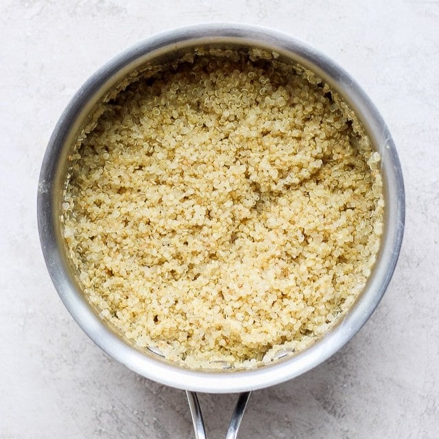 - To cook the quinoa, add the quinoa, ¾ cup water and salt to a pot. Bring to a boil, then reduce to simmer, cover and cook for 15 minutes until all the water is evaporated. Remove from heat, but keep the pot covered for 5 minutes. Fluff with fork and serve.