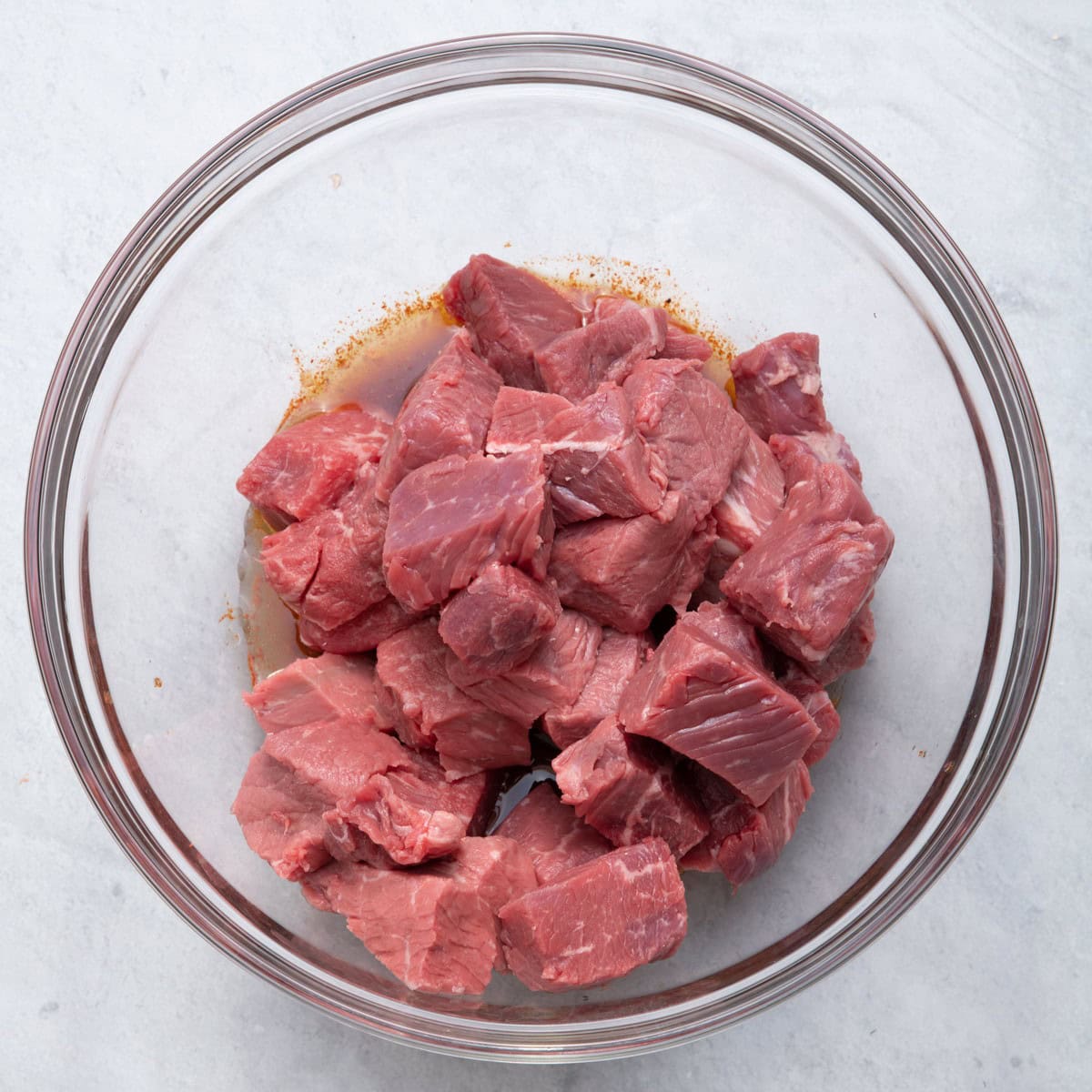- In a large bowl, place the olive oil, lemon juice, garlic, cumin, paprika, cardamom, salt and pepper, and whisk to combine. Add the beef chunks and stir to coat. Allow the beef to marinate for at least 2 hours or up to 24 hours.