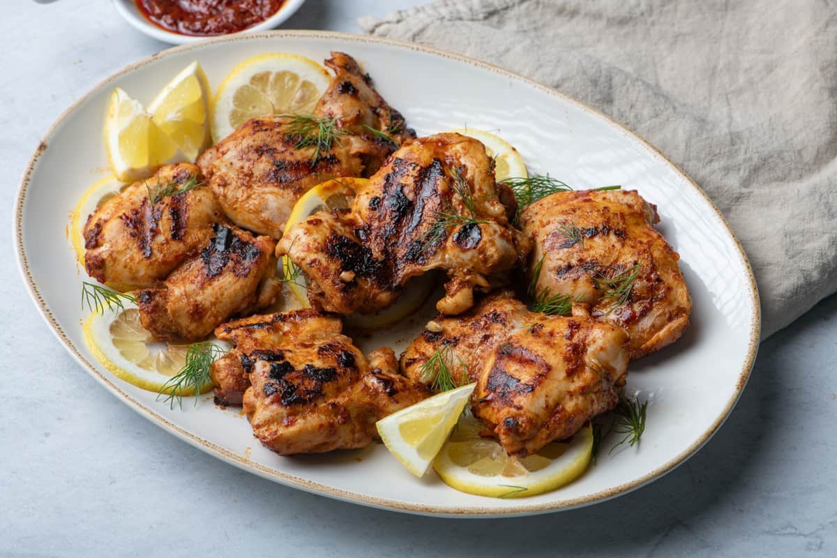 Grilled Harissa Chicken recipe with juicy chicken thighs marinated in harissa, garlic, lemon, and spices, then grilled and topped with fresh dill.