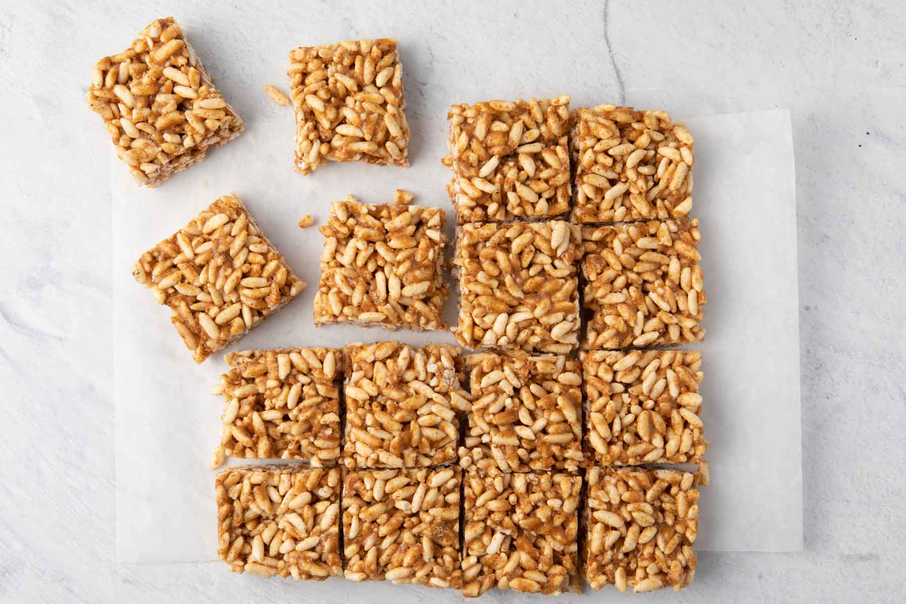 If you’re wondering if you can make Rice Krispie Treats without marshmallows, the answer is yes and the recipe is these Healthy Rice Krispie treats! This version is made with just 5 natural ingredients – almond butter, honey, and even brown puffed rice. So it’s the kind of treat that makes you feel good and you can feel good about serving. I love that they still have a crisp texture without any butter or marshmallows.
