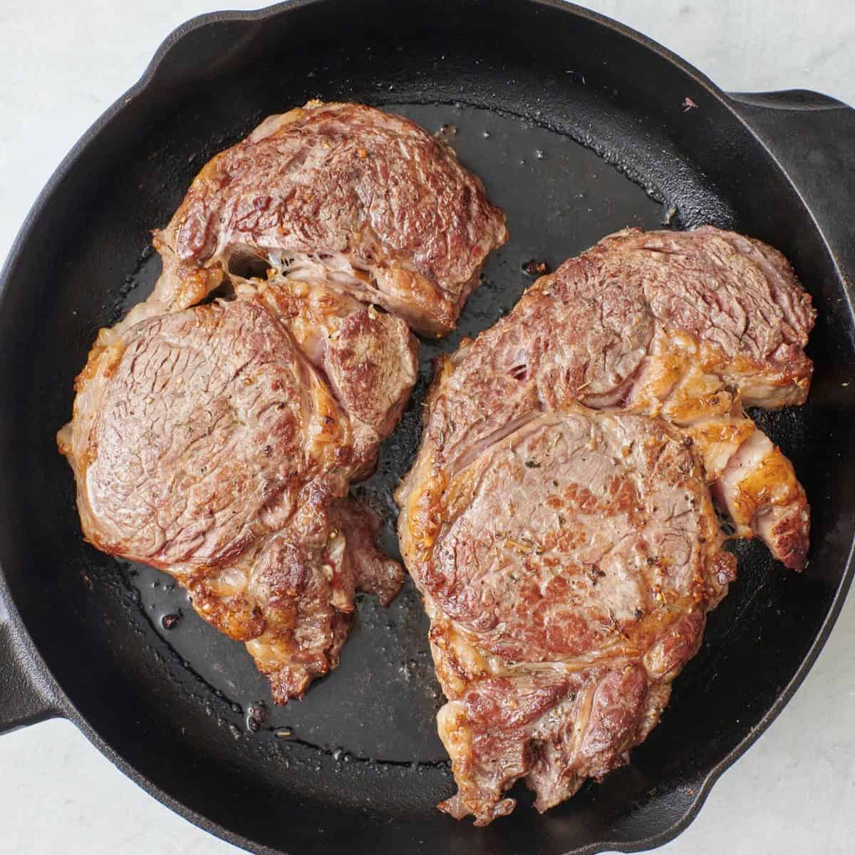 - Place the oven-safe skillet over high heat on the stovetop. Sear the seasoned steaks for 1-2 minutes on each side, or until they develop a nice brown crust.