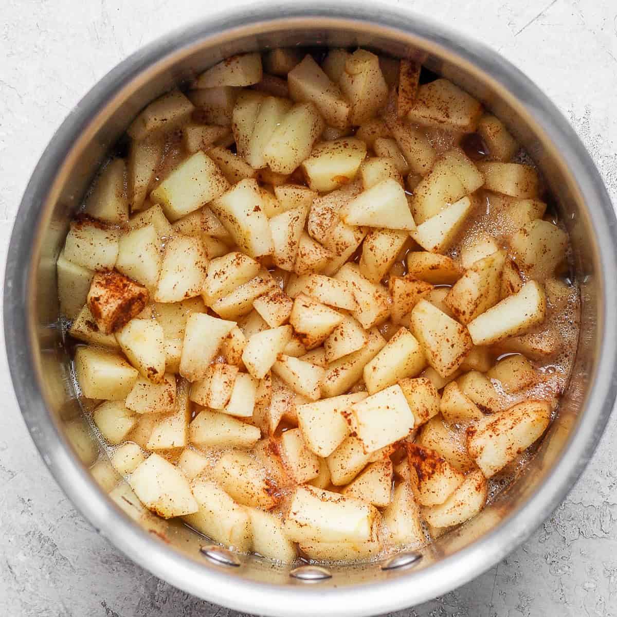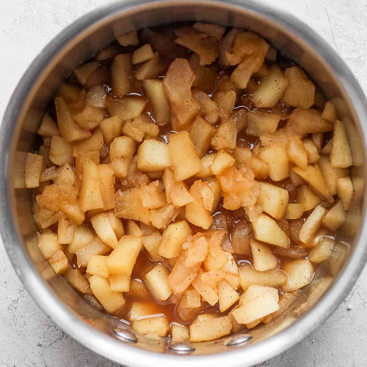 - Place all of your ingredients into a sauce pot and bring to a boil, reduce to a simmer and cook for 20 minutes or until the apples are soft.