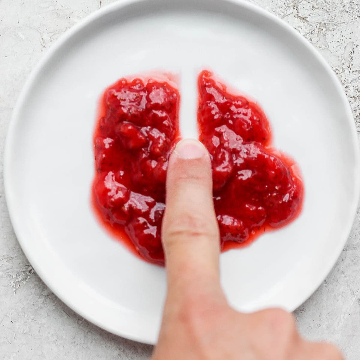 - To check for doneness, drop a small amount of jam onto a small frozen plate. Let cool for a moment, then run a spoon or finger through the jam. If you can draw a line with clean edges that don’t drip, then it is ready. If it runs back together, then cook for a few more minutes.