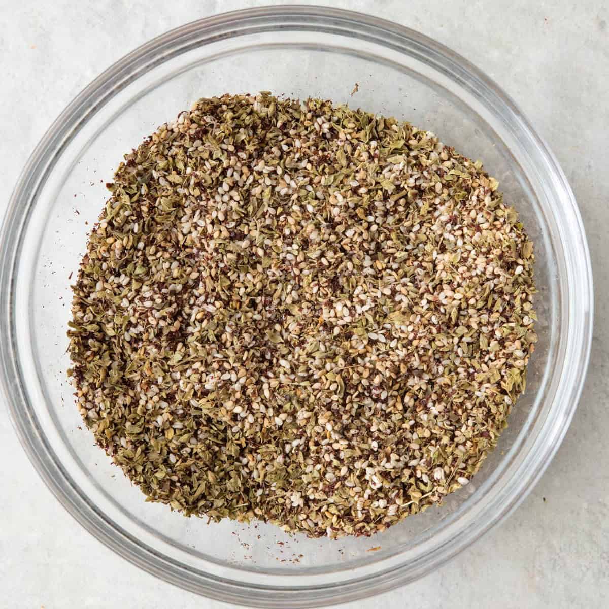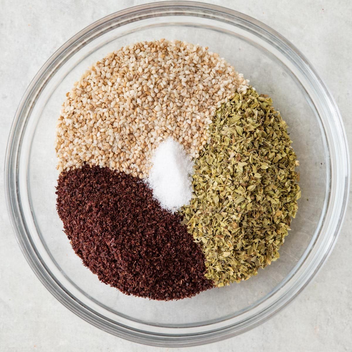 Homemade Za'atar is easy to make at home with just 4 spices: oregano, sumac, salt, and toasted sesame seeds.