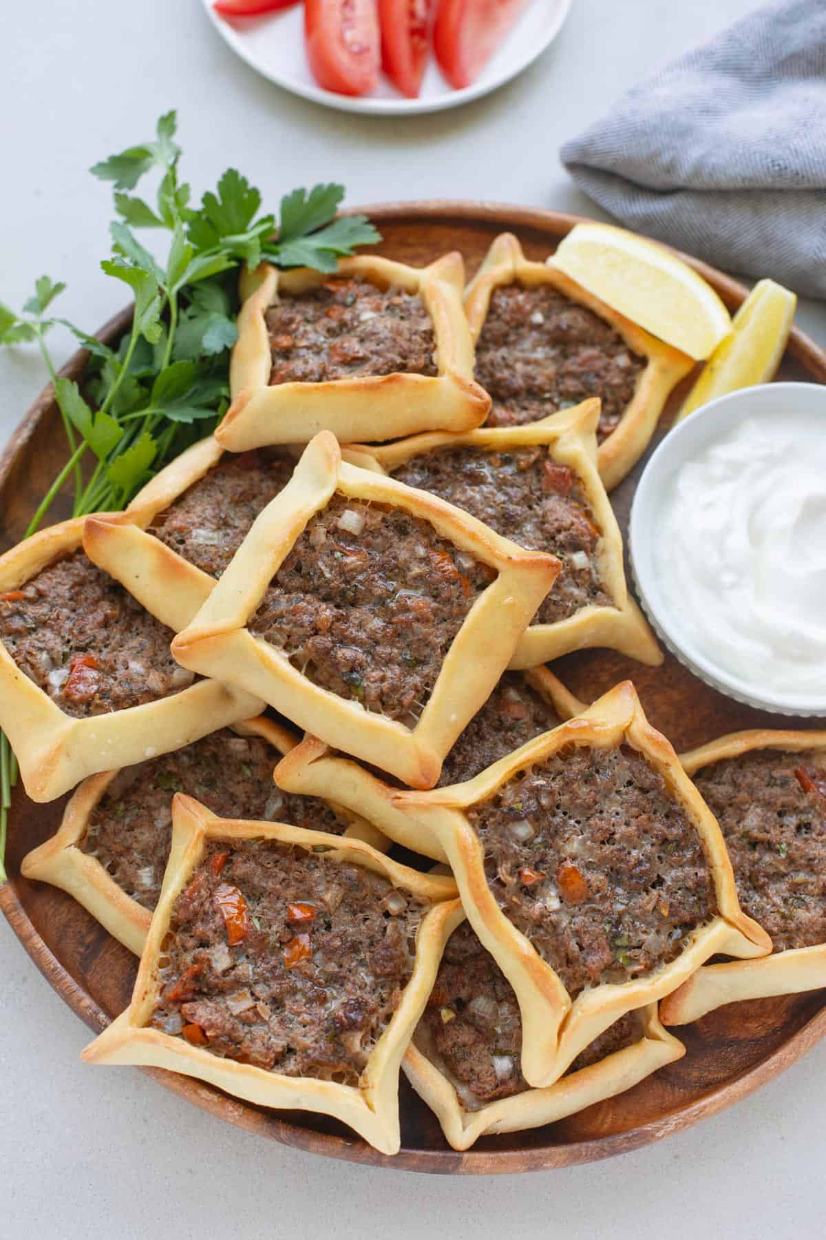 These Lebanese meat pies (sfeehas) are a delicious Middle Eastern appetizer. Made with an easy dough and stuffed with a spiced meat filling.