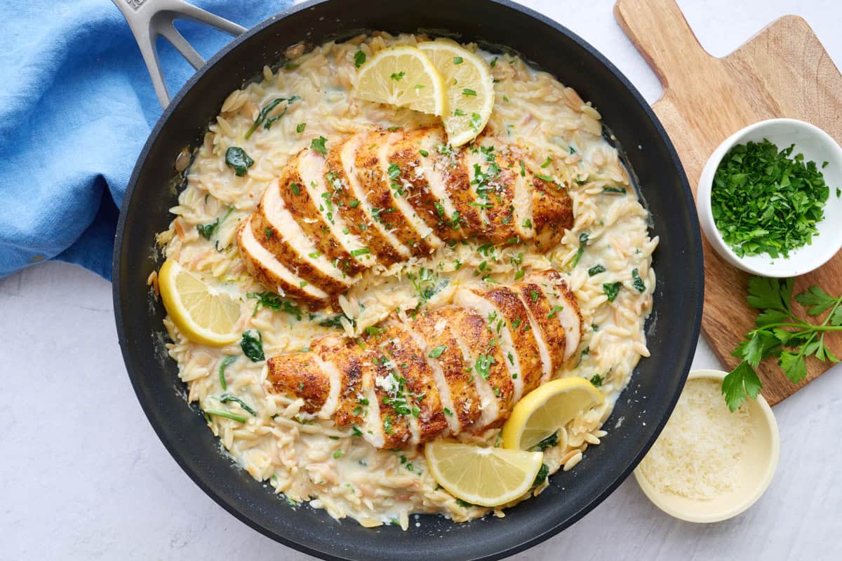 Anytime I can make dinner in one skillet, especially after a recipe testing day (the dishes are unreal), I’m in. The lemon chicken orzo recipe starts with seared chicken breasts, then the orzo cooks in broth in that same skillet. Everything finishes with milk, Parmesan, and lemon stirred in at the end to pull it together. Lemon chicken orzo is straightforward, contained, and doesn’t require bouncing between pots, which is really the point here.