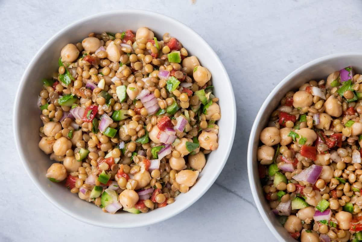 Fresh Lentil Salad made with green lentils, chickpeas, cucumbers, roasted red peppers, onion, and parsley. A lemon, olive oil, garlic, and za'atar dressing.