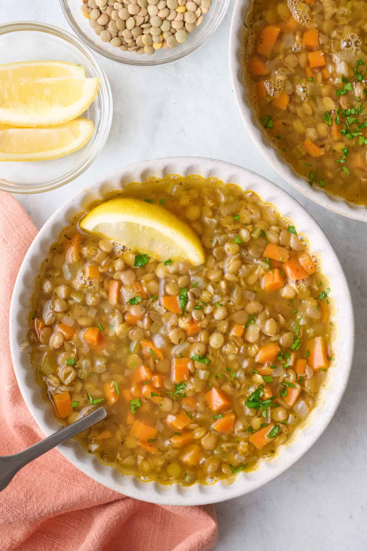 I have a lot of lentil soup recipes on my site (Crushed Lentil Soup, Lentil Kale Soup, Tomato Lentil Soup, Red Lentil Chicken Soup and Harira Soup made with lentils.) This lentil soup is the simplest version of all the ones on the site, made with basic ingredients like green lentils, onion, carrot, celery, and a squeeze of lemon at the end.
