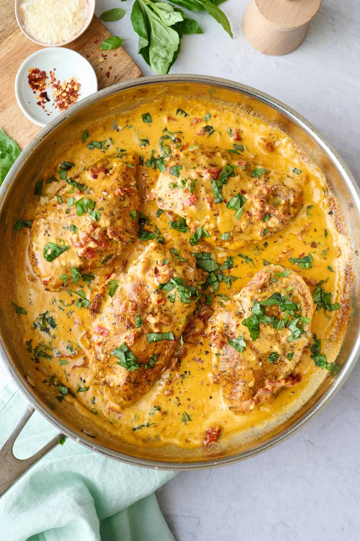 Creamy Marry Me Chicken made with seared chicken breasts simmered in a Parmesan and sun-dried tomato sauce for an easy one-pan dinner.