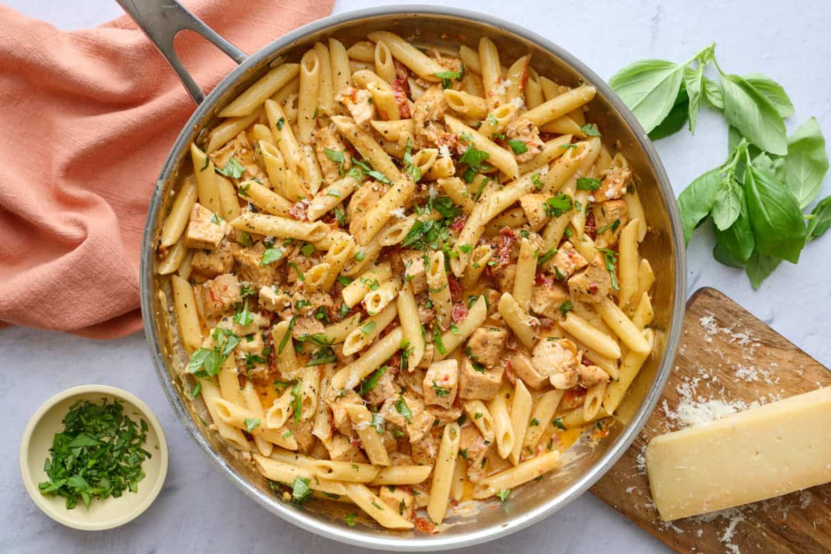 Marry me chicken pasta cooked with chicken, cream, Parmesan, and sun-dried tomatoes, then tossed with pasta until saucy.