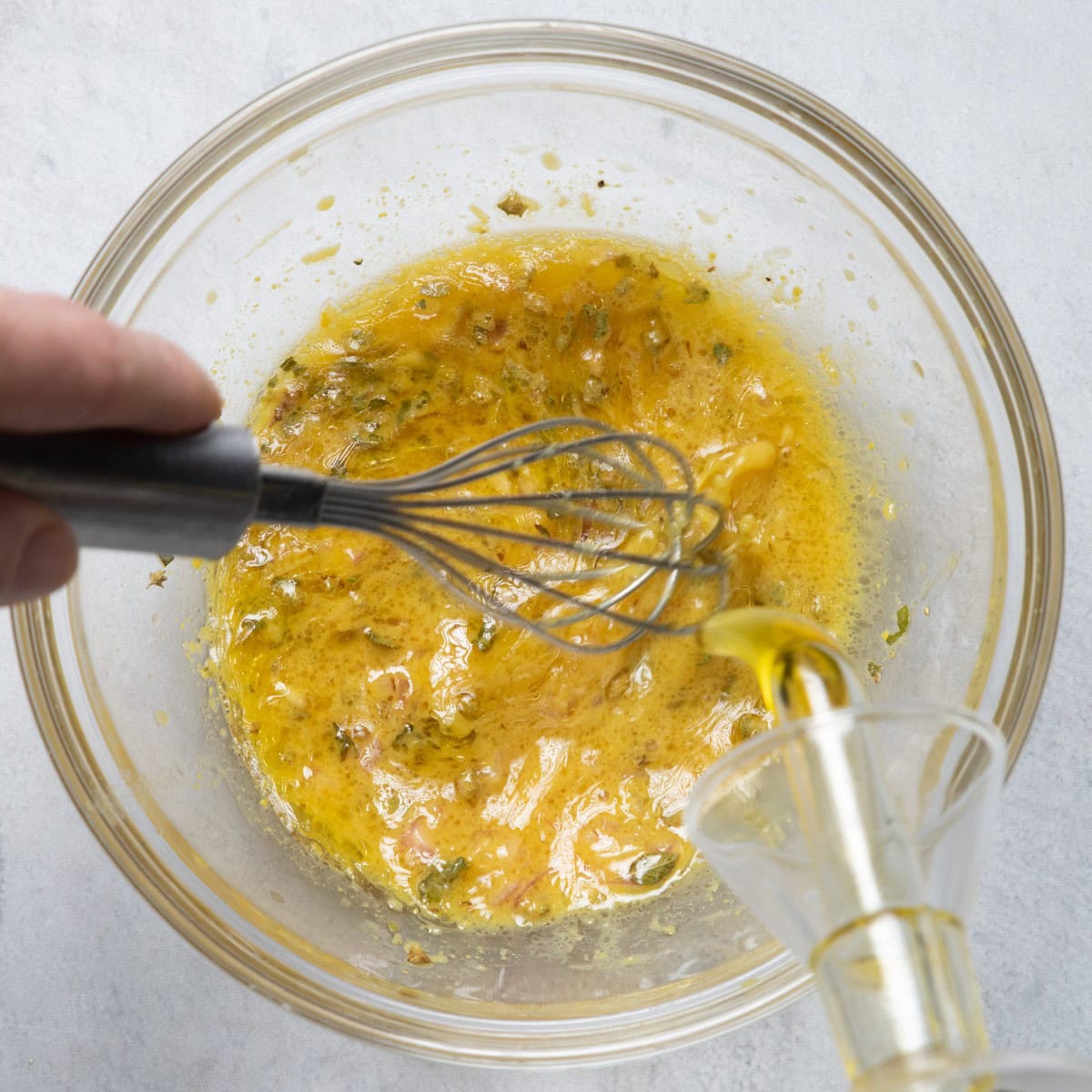 - Meanwhile, make the salad dressing. Mix shallot, Dijon, remaining 2 teaspoons red wine vinegar, remaining 1 teaspoon dried oregano, lemon zest, and lemon juice. Stream in remaining 3 tablespoons olive oil while whisking until emulsified.
