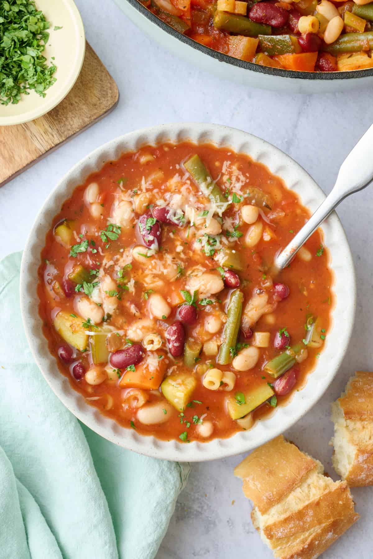 Minestrone soup made with fresh vegetables, beans, pasta, and herbs simmered in a tomato broth for an easy one-pot meal.