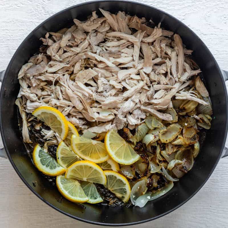 - Lower the heat to simmer, add the roasted onions, shredded chicken, lemon juice and lemon slices, and simmer for 20 minutes.