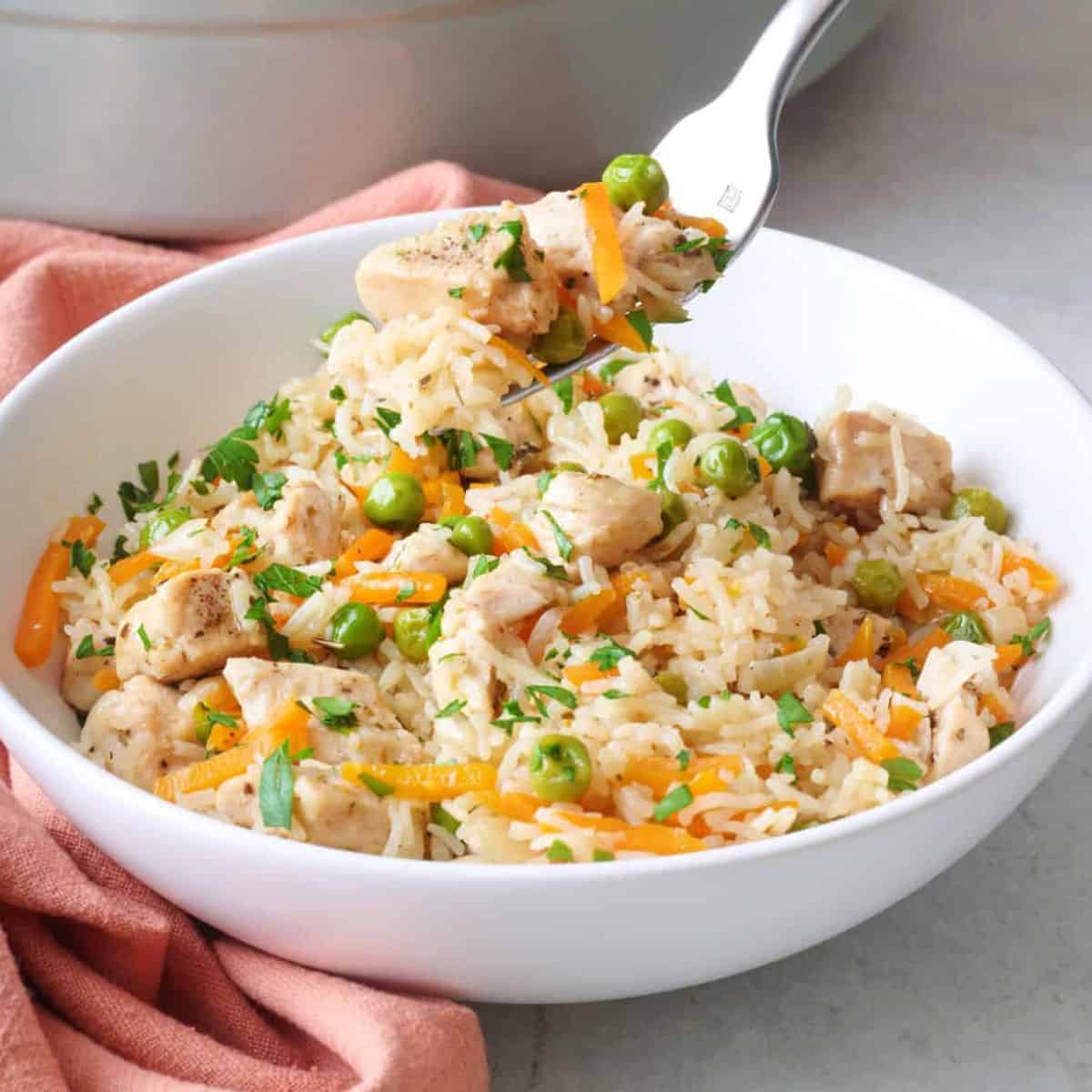 One pot chicken and rice recipe cooked in a single pot. It's made with chicken breast, frozen veggies, and rice altogether, just 10 minutes of prep time.