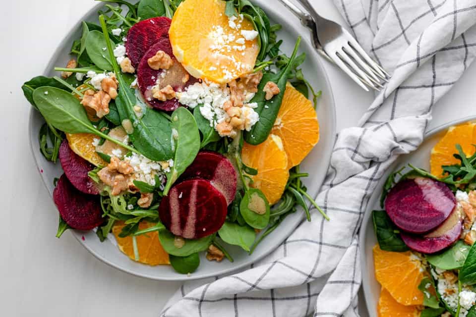 - Assemble the salad into one large bowl or two separate bowls. Start by placing the greens at the bottom, followed by interchanging layers of the sliced beets and sliced oranges. Crumble feta cheese on top along with walnuts and drizzle the dressing on top.