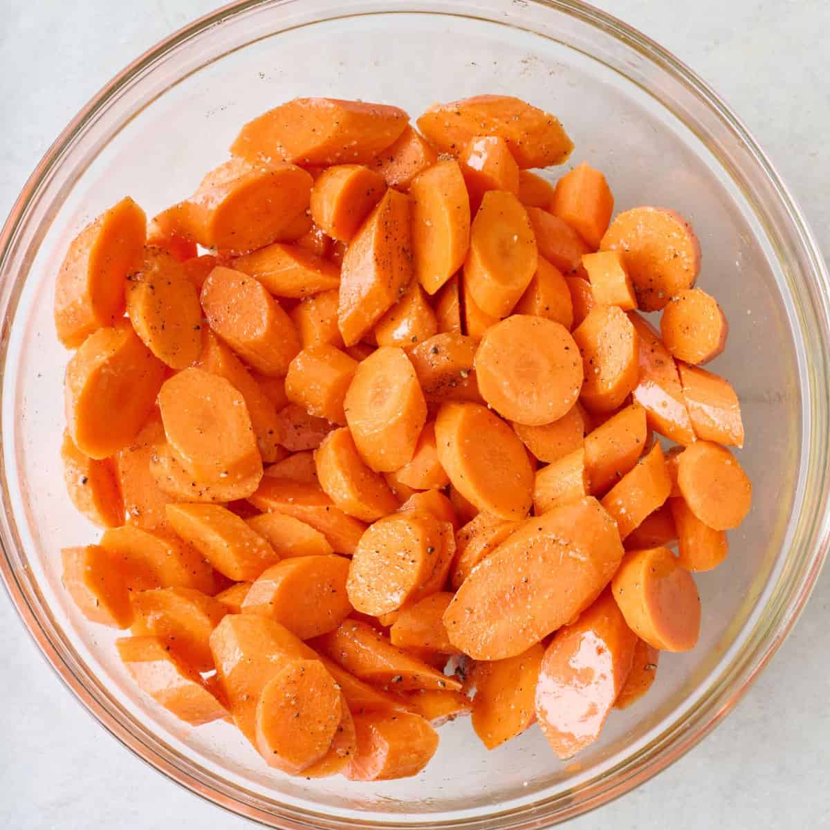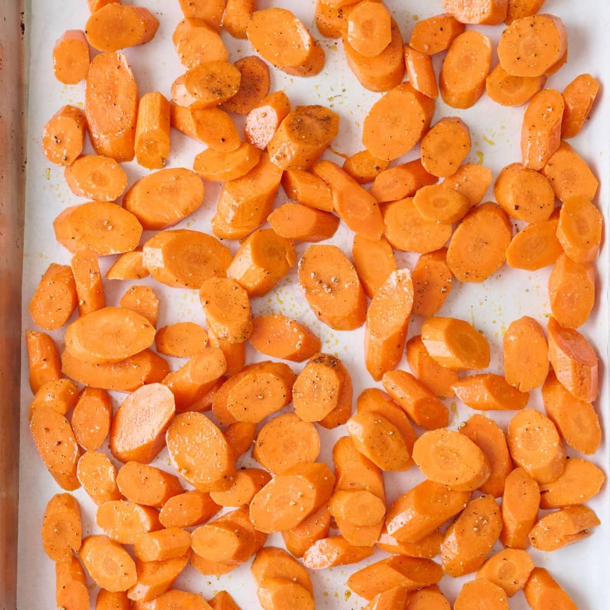 - My Top Tip: Cut the slices bigger than you think. Carrots shrink in the oven, so I recommend cutting them into large chunks no smaller than 1 inch thick.