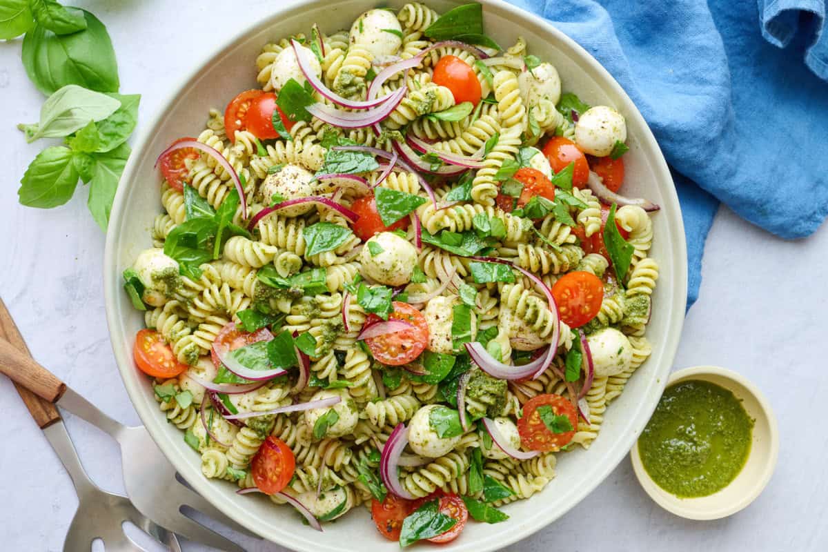 A simple pesto pasta salad tossed with lemon, mozzarella, tomatoes, spinach, and red onion. Easy to make, no cooking beyond the pasta.
