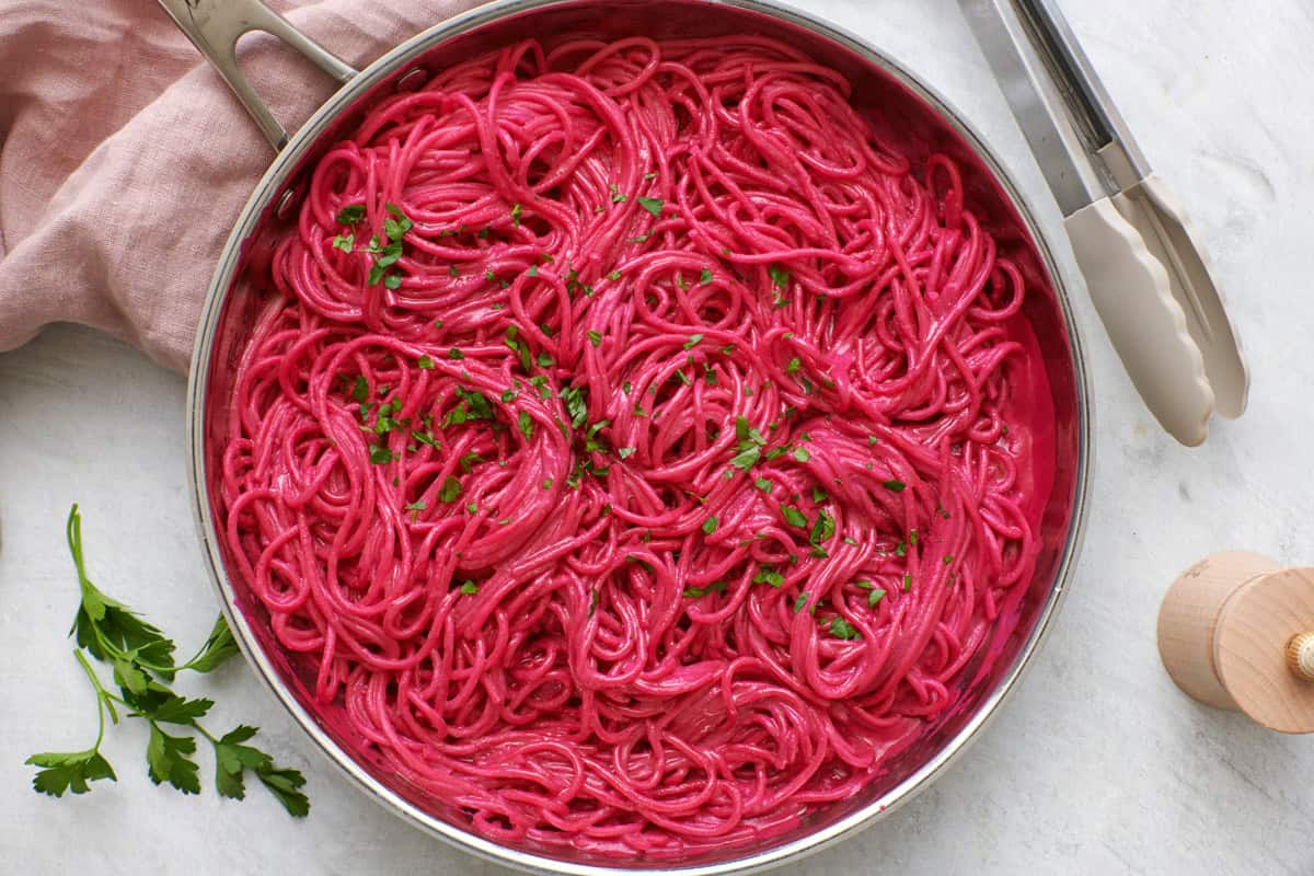 This pink pasta recipe is made with spaghetti tossed in a creamy beet, ricotta, Greek yogurt, and Parmesan pink sauce for a naturally vibrant color.