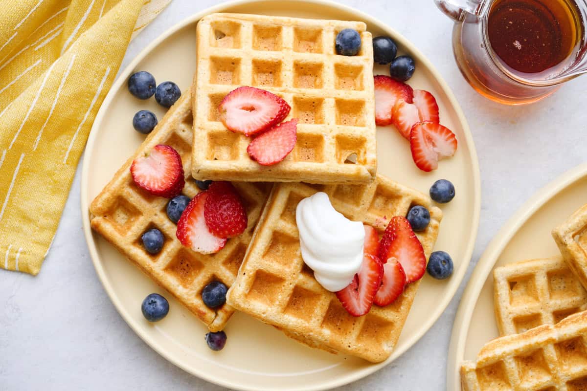 - Don’t overfill the waffle iron: Stick with about ⅓ cup of batter per waffle (or whatever works for your iron). If you pour too much, it spills out and cooks unevenly.
