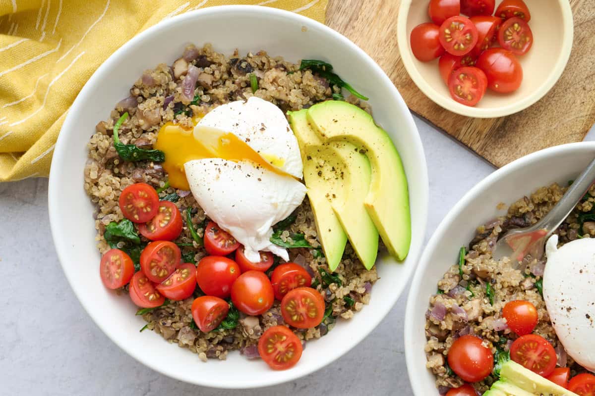 Savory quinoa breakfast bowl with mushrooms, spinach, and poached eggs. A filling way to use quinoa for breakfast.